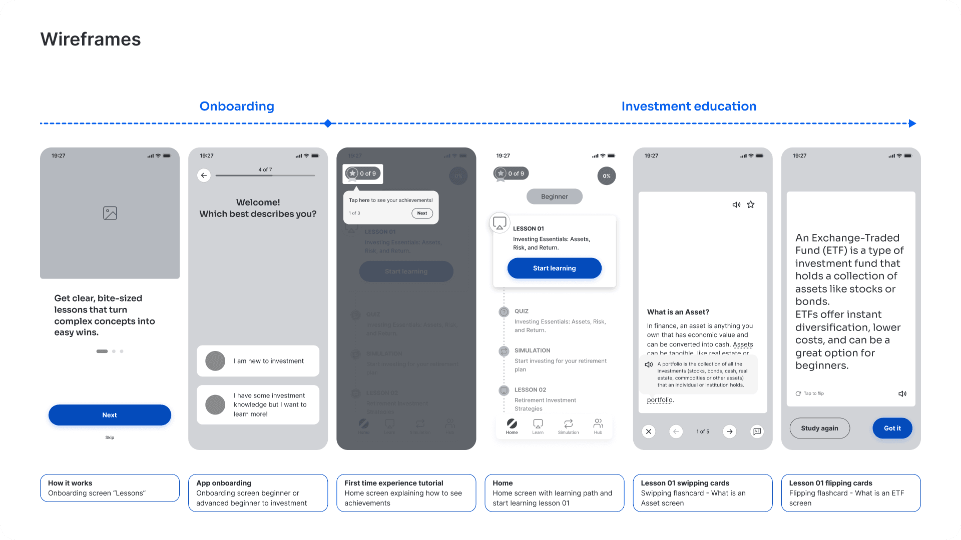 Low-Fidelity Wireframes: Mobile-first flows for onboarding, lessons, quizzes, and simulation—prioritizing clarity and thumb-reach.