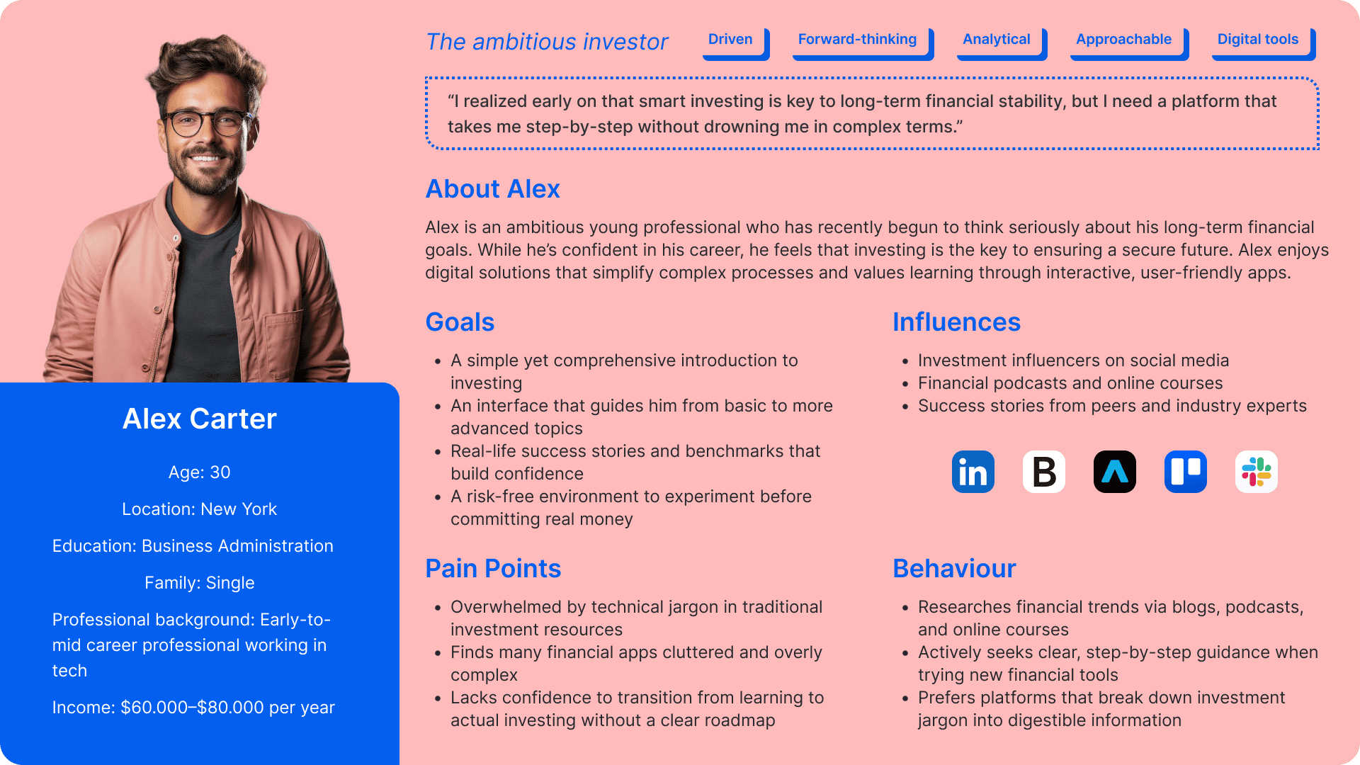 🔵 Needs: Plain‑language lessons, achievements and a clear path to real investing.